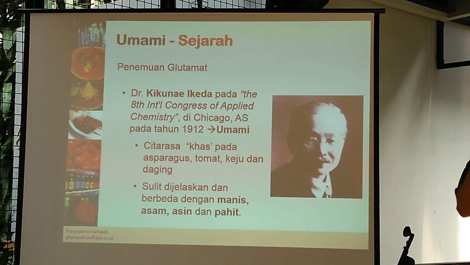Professor Purwiyatno menjelaskan bahwa penelitian tentang MSG yang merupakan unsur pembentuk umami telah dimulai sejak tahun 1908. Penelitan tersebut dilakukan di Jepang oleh Professor Kikunae Ikada yang meneliti unsur-unsur yang terdapat pada kombu (rumput laut Jepang) dan menemukan bahwa rasa sedap di dalam kombu merupakan kontribusi dari ion glutamat. Asam glutamat tidak mampu larut dalam air dan tidak memiliki rasa. Garam yang terkandung dalam glutamatlah yang pada umumnya mudah larut dan memiliki rasa yang sangat berbeda. Prof. Ikeda memberi nama “umami” untuk rasa gurih yang membuat cita rasa masakan menjadi lebih lezat. Prof. Ikeda lah yang pertamakali memperkenalkan umami sebagai rasa dasar kelima.