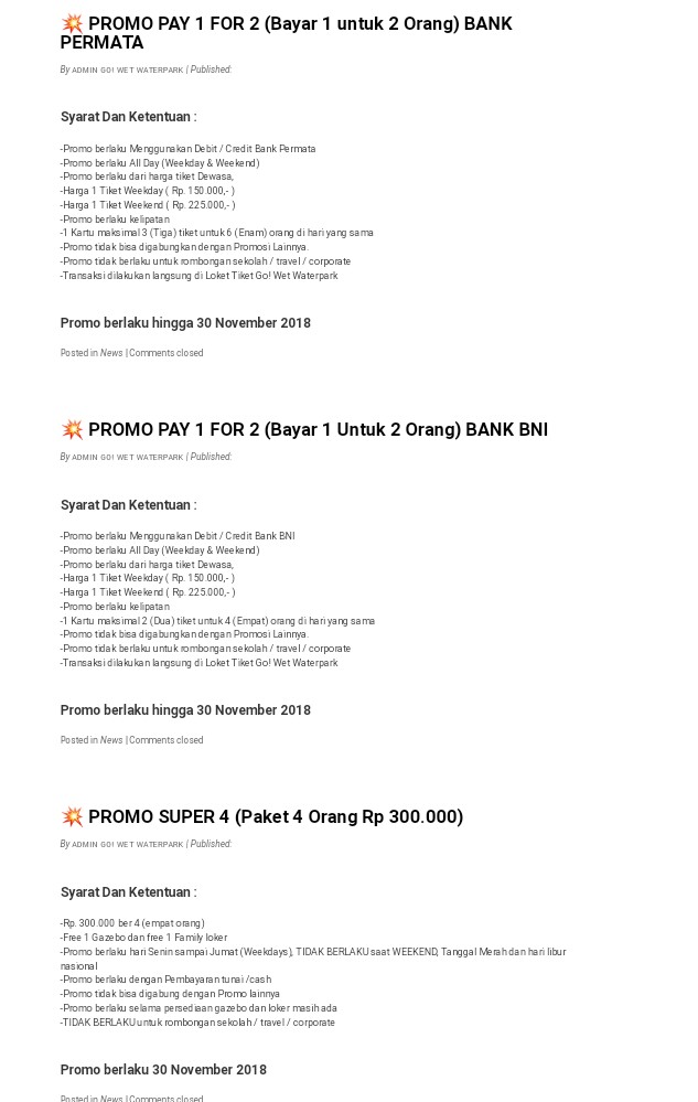 Oh ya Rp. 225.000,- itu tiket pada saat weekend dan hari libur nasional tapi kalau hari kerja, tiket masuk orang dewasa 150 ribu rupiah dan anak-anak 100 ribu rupiah. Eits kalian enggak usah khawatir, untuk harga tiket nih, banyak promo kog yang bisa diperoleh. Ini nih promo harga tiket bulan November dan Desember 2018. Kalian bisa juga beli tiket Go Wet secara online. Jadi tetap dapat harga promo. Tuh tunggu apalagi? Buru deh rasakan sensasi bermain wahana air di Go Wet Waterpark Grand Wisata Bekasi.