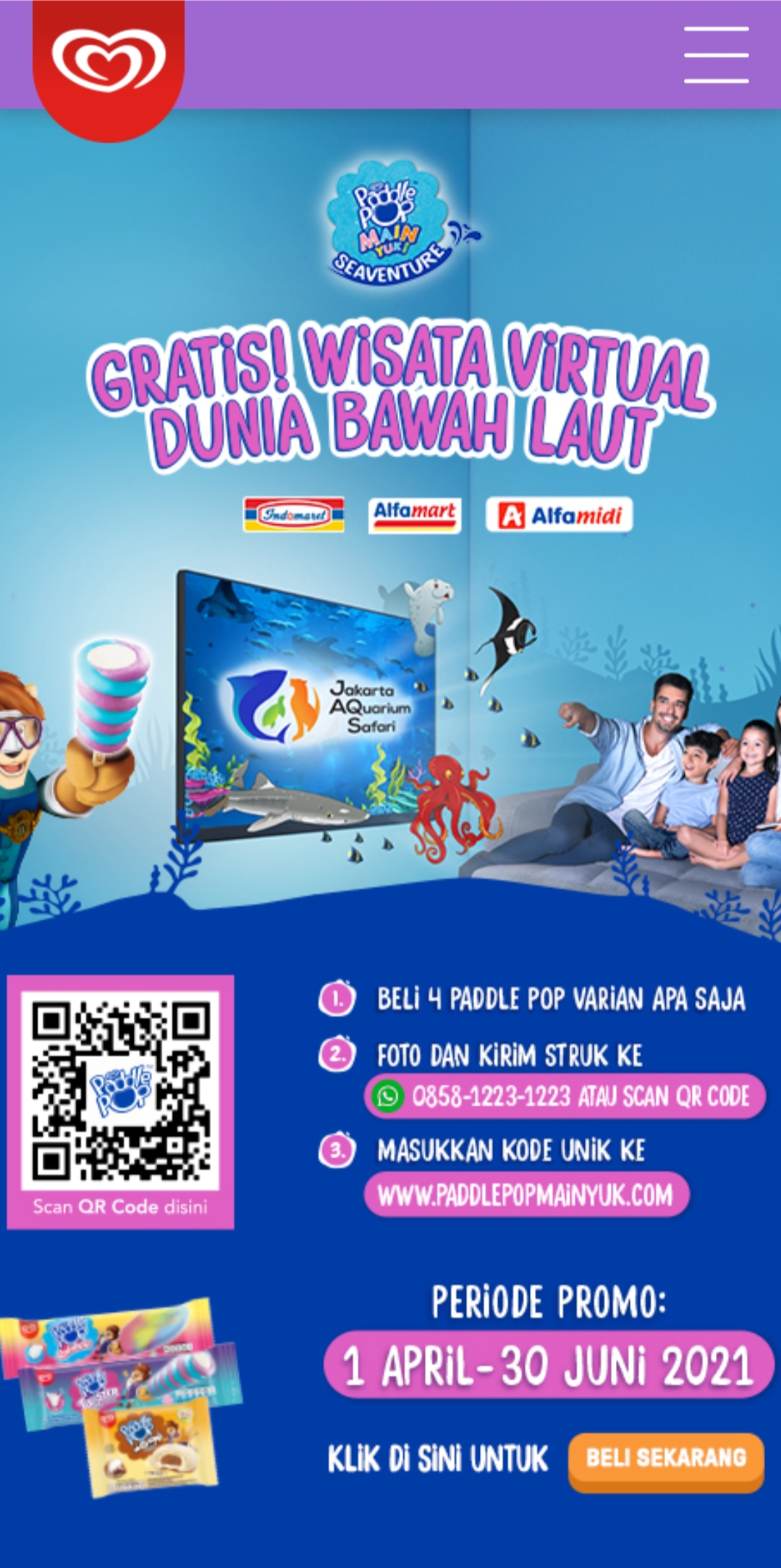 Paddle Pop Seaventure ini bisa diikuti dari bulan April hingga Juni 2021. Oh ya setelah menunggu beberapa hari akhirnya saya memperoleh konfirmasi dari Tim Paddle Pop, sebagai berikut: “Hi! Teman Paddle Pop, selamat struk belanja kamu dengan nomor EF43-226-1605T3Z3 yang diunggah pada tanggal 14-May-2021 pukul 07:51 adalah VALID. Kamu dapat menikmati Wisata Virtual Dunia Bawah Laut, GRATIS!.Silakan mengunjungi website Paddle Pop Main Yuk Seaventure kemudian masukkan kode unik ini BMJCQ4. Kode unik ini hanya bisa dipakai 3x. Informasi lebih lanjut terkait mekanisme penggunaan kode unik ini silakan kunjungi link berikut: bit ly/TncPaddlePop. Untuk pengalaman Wisata Virtual Dunia Bawah Laut yang lebih menyenangkan, kami sarankan untuk mengakses website melalui Laptop/PC Desktop dari browser apapun”.