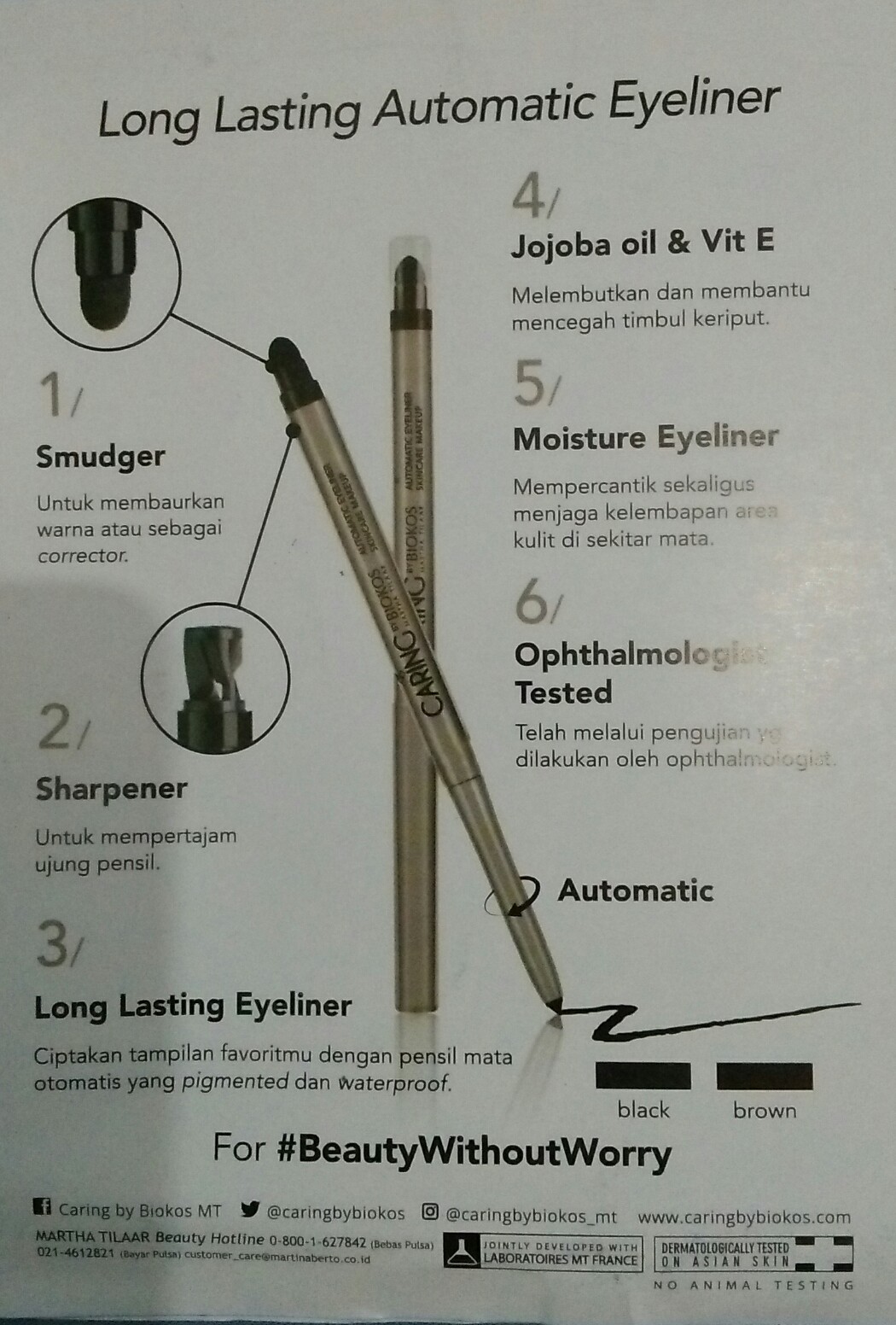 Automatic eyeliner ini merupakan produk terbaru dari Caring by Biokos, yang merupakan skin care makeup yaitu makeup yang tidak hanya mempercantik, tapi merawat kulit sekitar mata. Kandungan dari automatic eyeliner ini terdiri dari Vitamin E yang berfungsi melembabkan area sekitar mata. Jojoba Oil yang melembutkan, melembabkan dan membantu mencegah timbulnya kerutan serta Soya Lecithin yang membantu memberikan efek melembabkan yang long lasting.