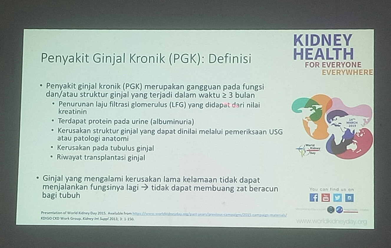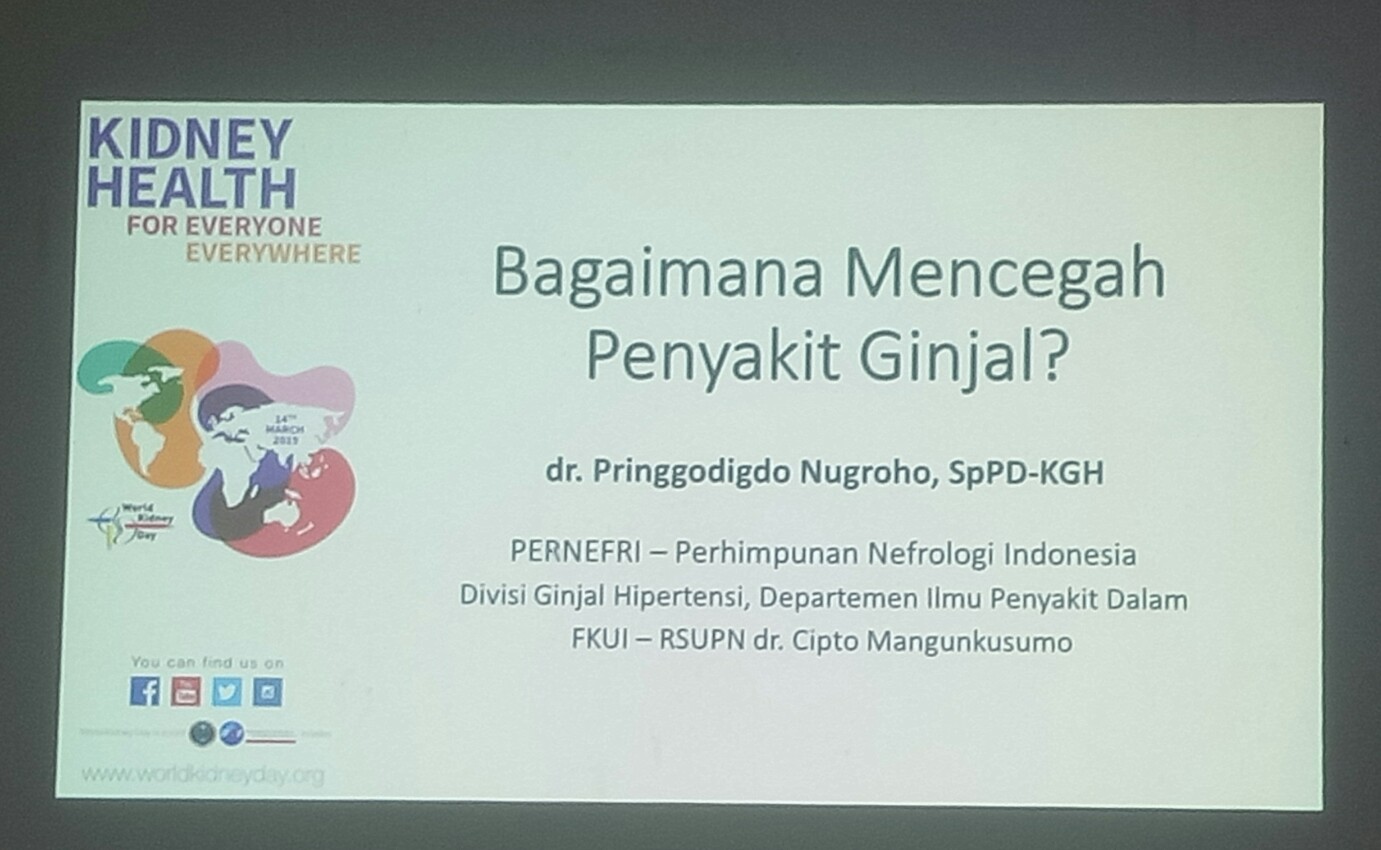 Dalam kesempatan tersebut hadir dr. Pringgodigdo yang menjelaskan mengenai penyakit ginjal kronis. Menurut dr. Pringgodigdo, ada beberapa faktor resiko penyakit ginjal kronis, yaitu: