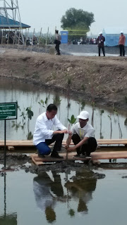 Presiden juga meninjau langsung area tambak dan hutan bakau yang baru saja direvitalisasi. Tambak dan hutan bakau yang dikelola kelompok petambak Muara Gembong memiliki luas kurang lebih 17 hektar. Presiden didampingi oleh WaGub Jawa Barat, Bpk Dedi Mizwar dan Dirut Bank Mandiri, Bapak Tiko menyerahkan bantuan berupa kincir air, alat pemberian makan ikan, penanaman bibit bakau serta benih udang vanamae dan benih ikan bandeng. Ikan bandeng dibudidayakan secara bersamaan dengan tanaman mangrove.
