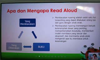 Ibu Roosie Setiawan, founder Reading Bugs memaparkan secara detil mengenai membacakan nyaring atau read aloud. Pada saat membacakan nyaring, ada tiga hal yang harus diperhatikan,yaitu berapa menit waktu yang digunakan untuk membacakan nyaring, apa yang didapat dari kegiatan tersebut dan apa yang dirasakan ketika kegiatan membacakan nyaring dilakukan. Read aloud atau membacakan nyaring merupakan proses menuangkan kemampuan literasi usia dini. Didalamnya terdapat proses mendengar/menyimak, berbicara, membaca, menulis dan pengenalan kosa kata.