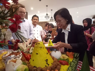 Sejujurnya saya cukup terkesima dengan kehadiran nasi tumpeng dalam perayaan 70 tahun hubungan Indonesia-Amerika ini. Ngga nyangka saja ternyata dalam acara yang melibatkan negara lain pun, nasi tumpeng disajikan sebagai makanan utama dan pihak kedutaan Amerika pun menyambut antusias nasi tumpeng ini. Sebagai orang Indonesia sudah sepantasnya saya merasa bangga dengan kekayaan budaya bangsa saya sendiri.