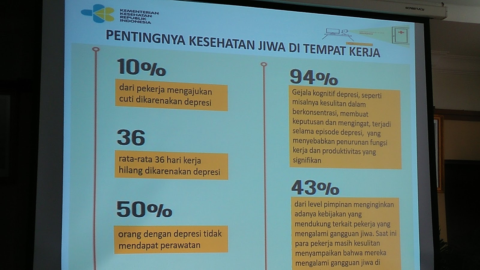 Kesehatan jiwa di tempat kerja penting diperhatikan karena selain mempengaruhi produktivitas kerja, dapat pula menyebabkan biaya pelayanan kesehatan meningkat karena perusahaan harus membiayai berobat karyawannya. Hampir 94% karyawan menderita gejala kognitif depresi seperti misalnya kesulitan dalam berkonsentrasi, membuat keputusan dan mengingat. Jika terjadi depresi maka menyebabkan penurunan fungsi kerja dan produktivitas yang signifikan. Dan fakta menunjukkan rata-rata 36 hari kerja hilang dikarenakan depresi.