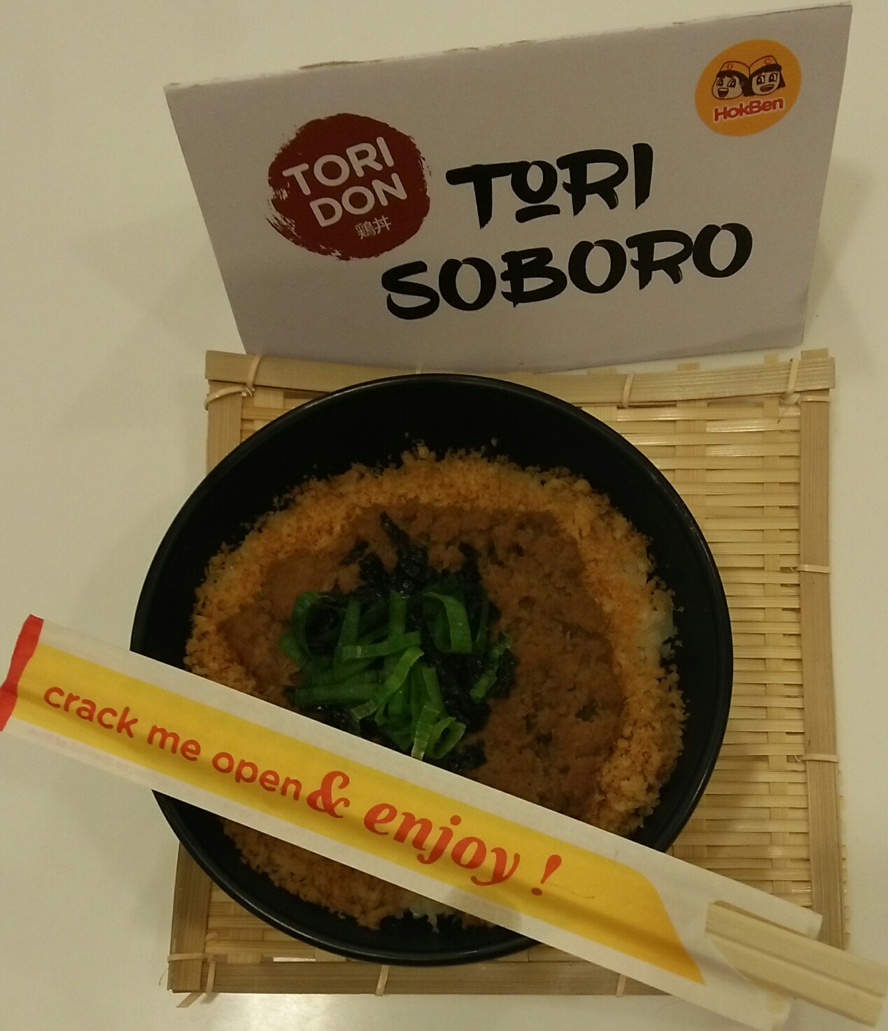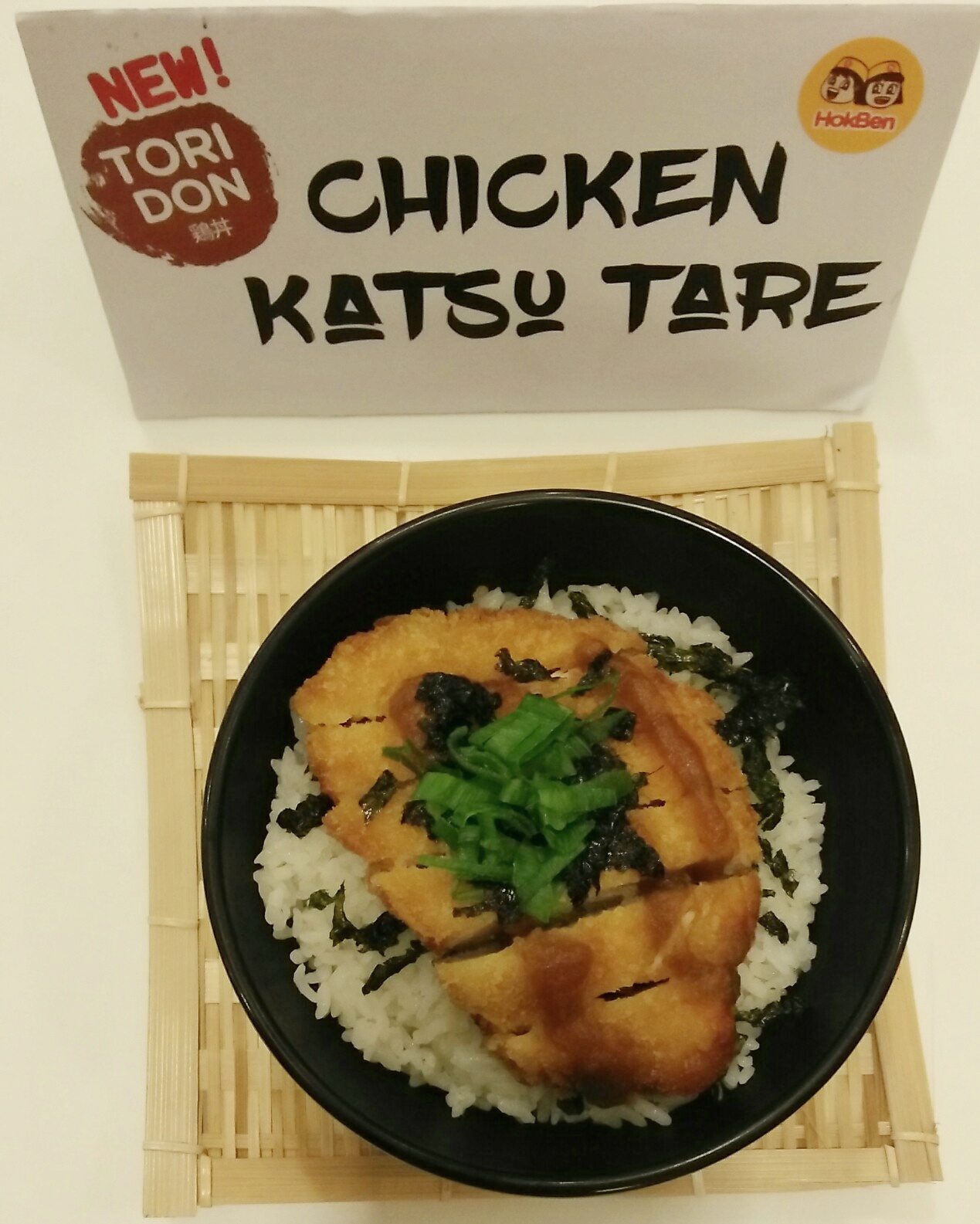 Sepotong daging dada ayam tanpa tulang yang digoreng berbalur tepung panir dan diberi saos khas HokBen. Disajikan diatas semangkuk nasi pulen Jepang dan ditaburi dengan potongan rumput laut dan irisan daun bawang.
