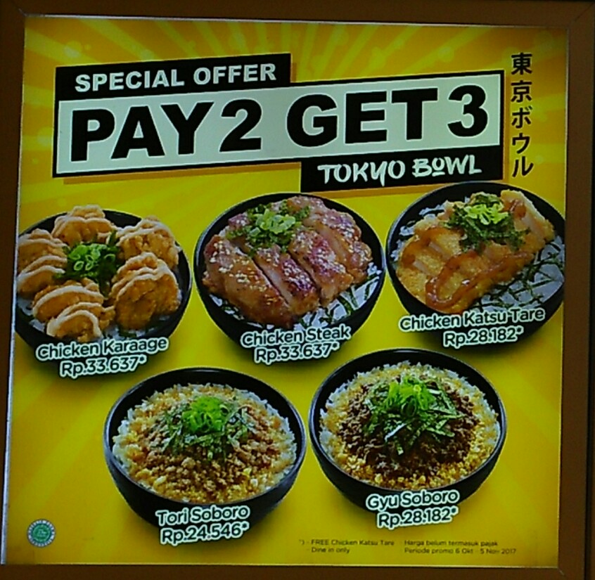 Selain program challenge tersebut, Menu Tokyo Bowl juga memiliki promo pembelian lho! Untuk dine in atau makan ditempat, Menu Tokyo Bowl menawarkan promo beli 2 dapat 3. Asyik khan. Duh Saya jadi ketagihan terus deh untuk menikmati sensasi lezatnya menu Tokyo Bowl. Siapa tahu Saya beruntung dan bisa pergi ke Jepang. Amiin.