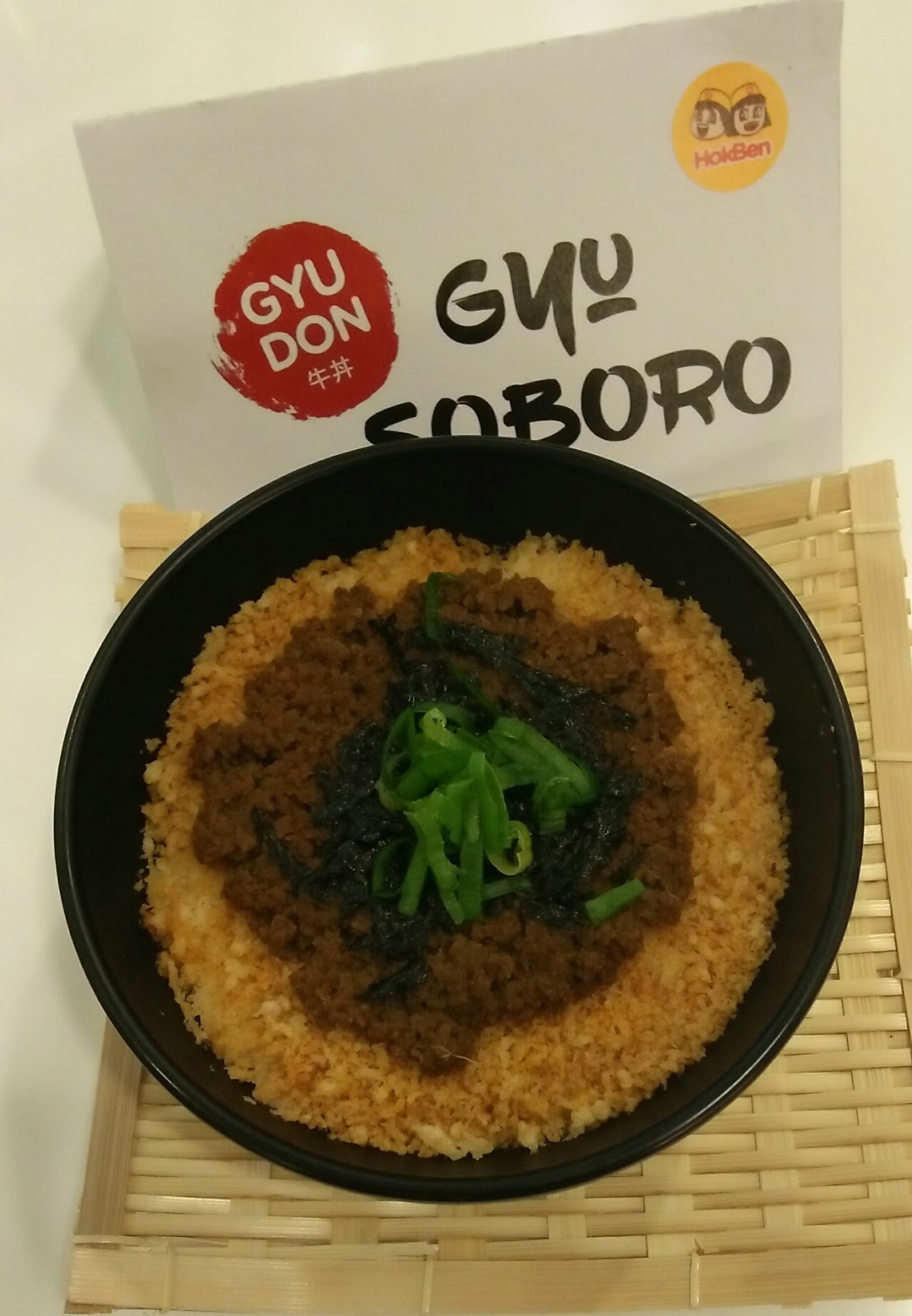 Gyu atau dalam bahasa Indonesianya berarti daging sapi adalah hidangan yang terdiri dari daging cincang dengan saus teriyaki khas HokBen yang disajikan di atas semangkuk nasi pulen Jepang. Diatasnya ditaburi potongan rumput laut, crispy khas HokBen dan irisan daun bawang. Rasa Gyu Don Soboro manis gurih. Daging sapi cincangnya lembut dan mudah sekali untuk dikunyah.