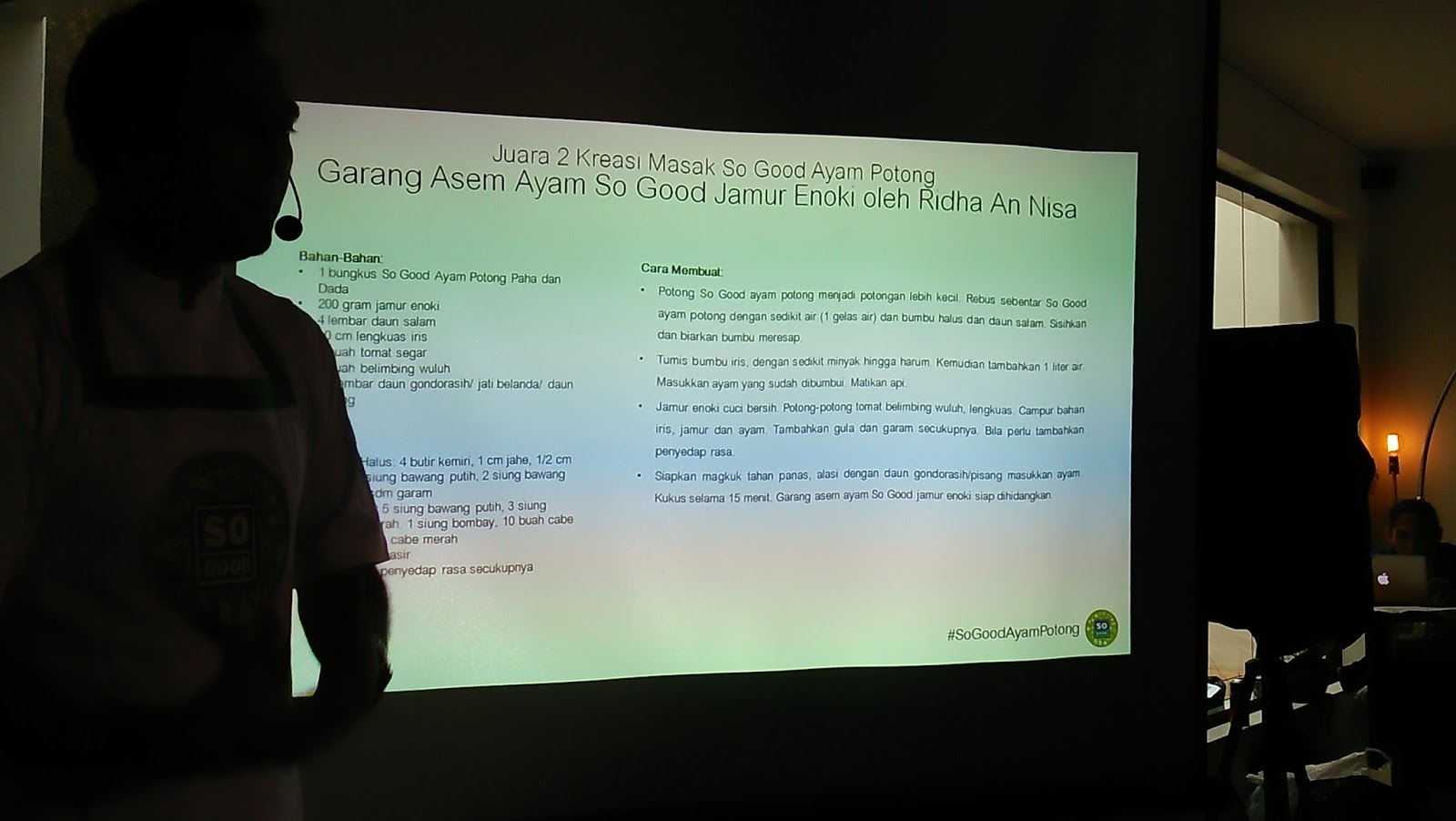 Pernyataan Bu Any tersebut semakin diperkuat dengan penjelasan yang dipaparkan oleh Mas Hartono Ho selaku Brand Manager PT. So Good. Mas Hartono menjelaskan bahwa pemenang-pemenang yang dipilih adalah mereka yang berhasil menghadirkan kreasi masakan yang menggunakan atau memilih bahan-bahan yang mudah dicari dan tepat. Bahan-bahan itulah yang membuat masakan menjadi lezat dengan tekhnik dan cara pengolahan serta penyajian yang menarik tanpa mengurangi nilai gizinya.