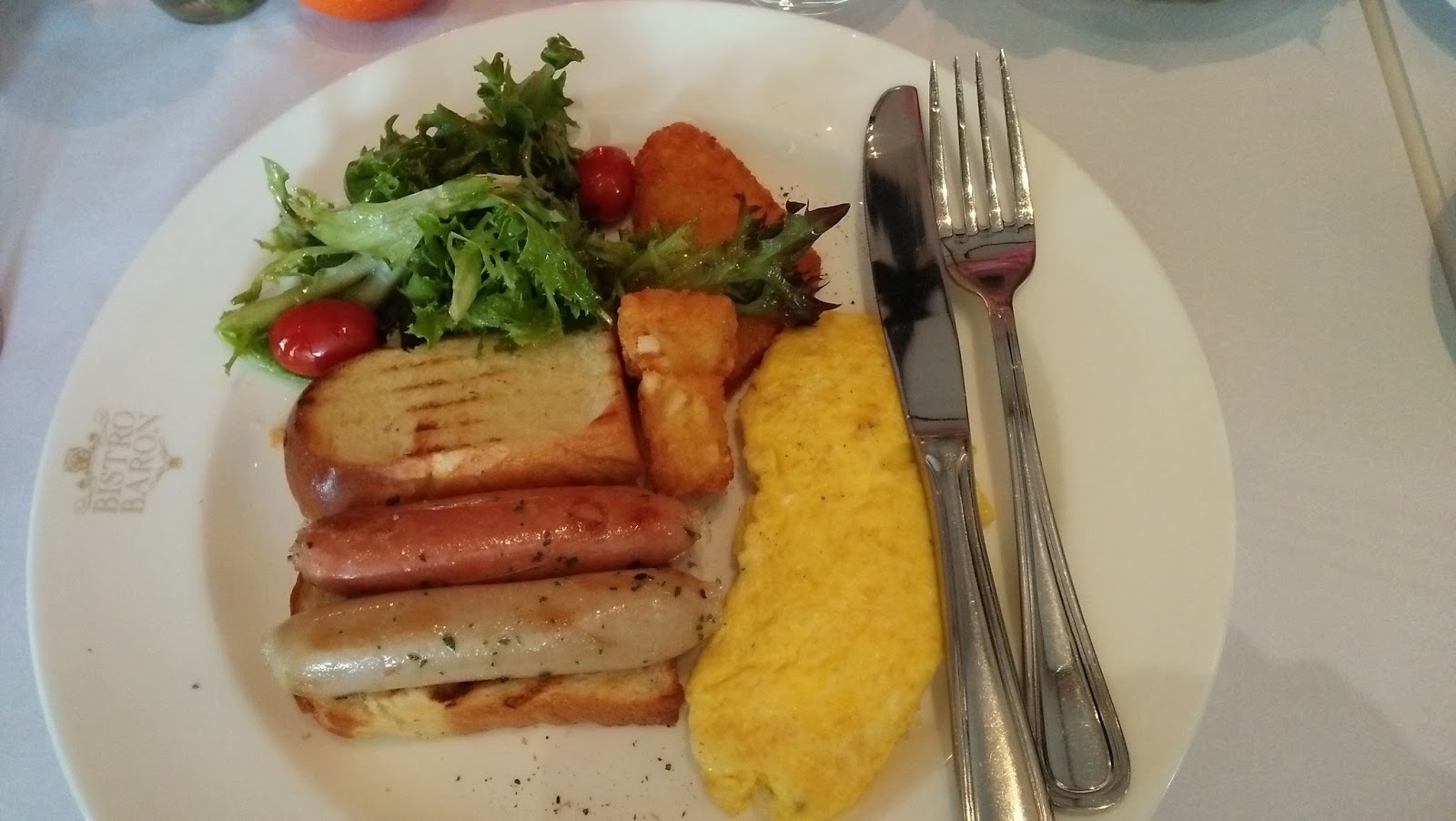 Tak perlu menunggu waktu cukup lama, datanglah Omelette pesanan saya. Oh Tuhan, lengkap sekali isi dari seporsi Omelette ini, teriak saya dalam hati. Seporsi Omelette yang saya pesan terdiri dari dua buah roti tawar yang dipanggang sebentar, sepotong telur dadar dengan ukuran cukup besar yang berisi cincangan jamur, sebuah sosis sapi, sebuah sosis ayam, dua potong potato platter dan salad sayuran dengan tomat cerry yang disiram saos salad dengan rasa yang super duper enak. Seriusan, baru kali ini saya makan salad seenak ini. Saya langsung jatuh hati dengan rasa dan tampilan menu sarapan Bistro Baron. Tadinya saya pikir, ah paling cuma telor dadar biasa saja dan lagi-lagi saya salah.