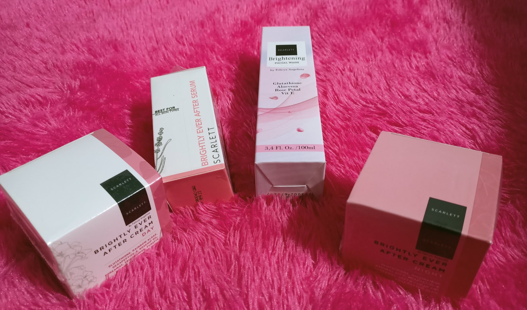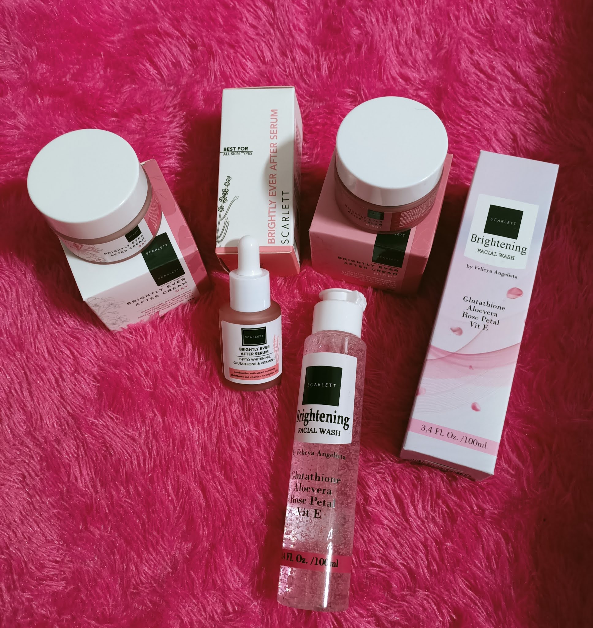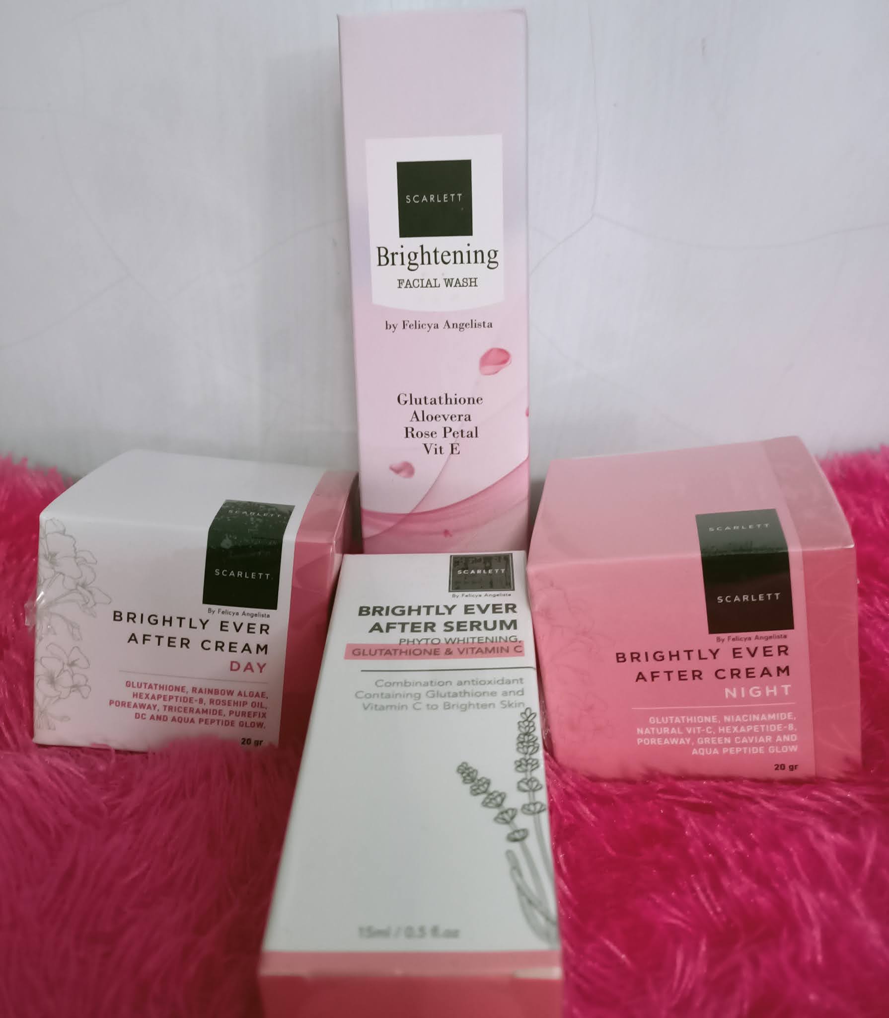 Rangkaian produk Scarlett Whitening Complete Brightly Face Care ini berisikan 4 produk yang terdiri dari :