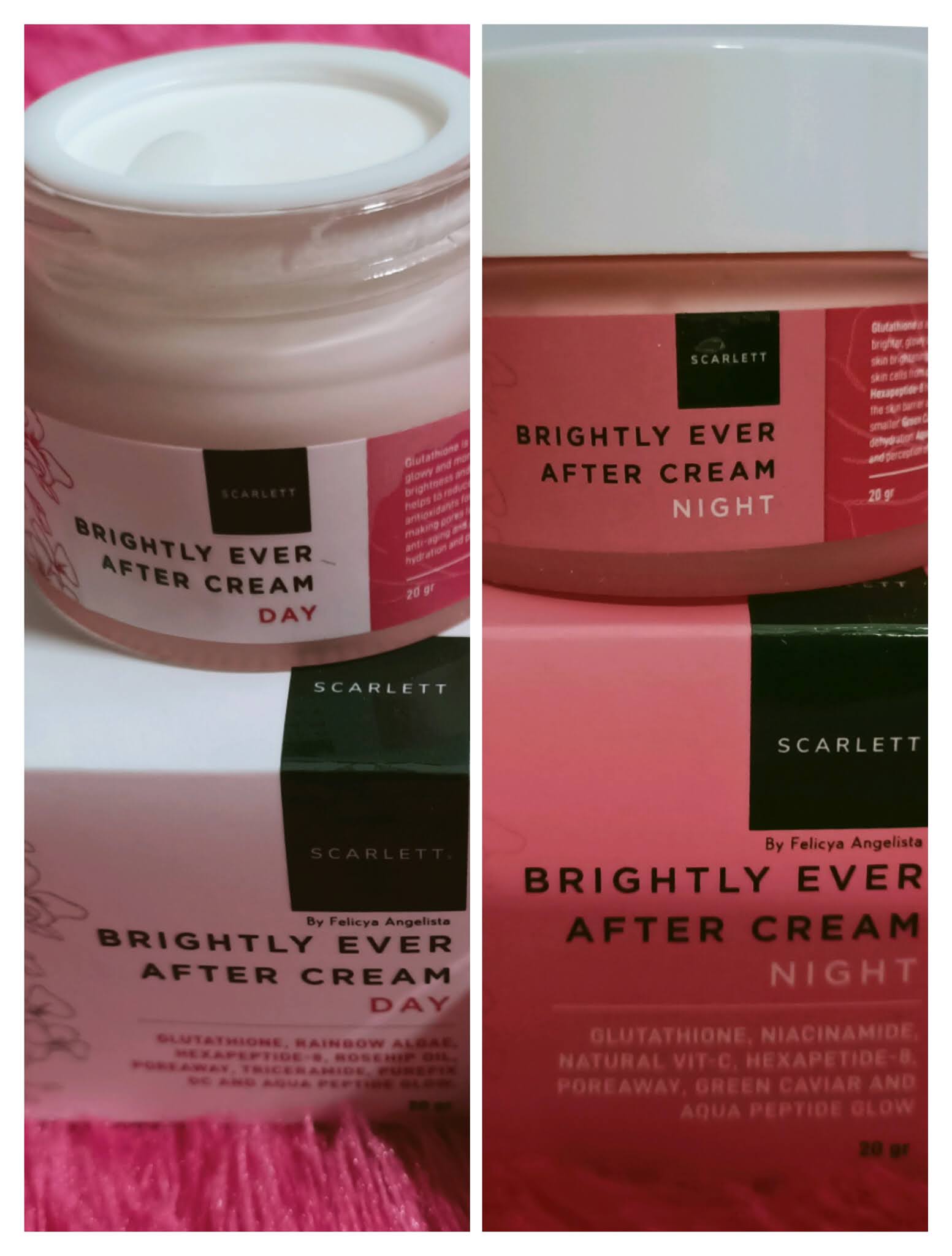 Seperti yang sudah saya sebutkan sebelumnya setelah membersihkan wajah dan menggunakan serum, saya juga memakai Scarlett Whitening Brightly Ever After Cream Day dan Night pada siang dan malam hari. Brightly Ever After Cream Day and Night memiliki kandungan Glutathione, Rainbow Algae, Hexapeptide-8, Rosehip Oil, Poreaway, Triceramide dan Aqua Peptide Glow yang memiliki beberapa manfaat untuk kulit wajah.