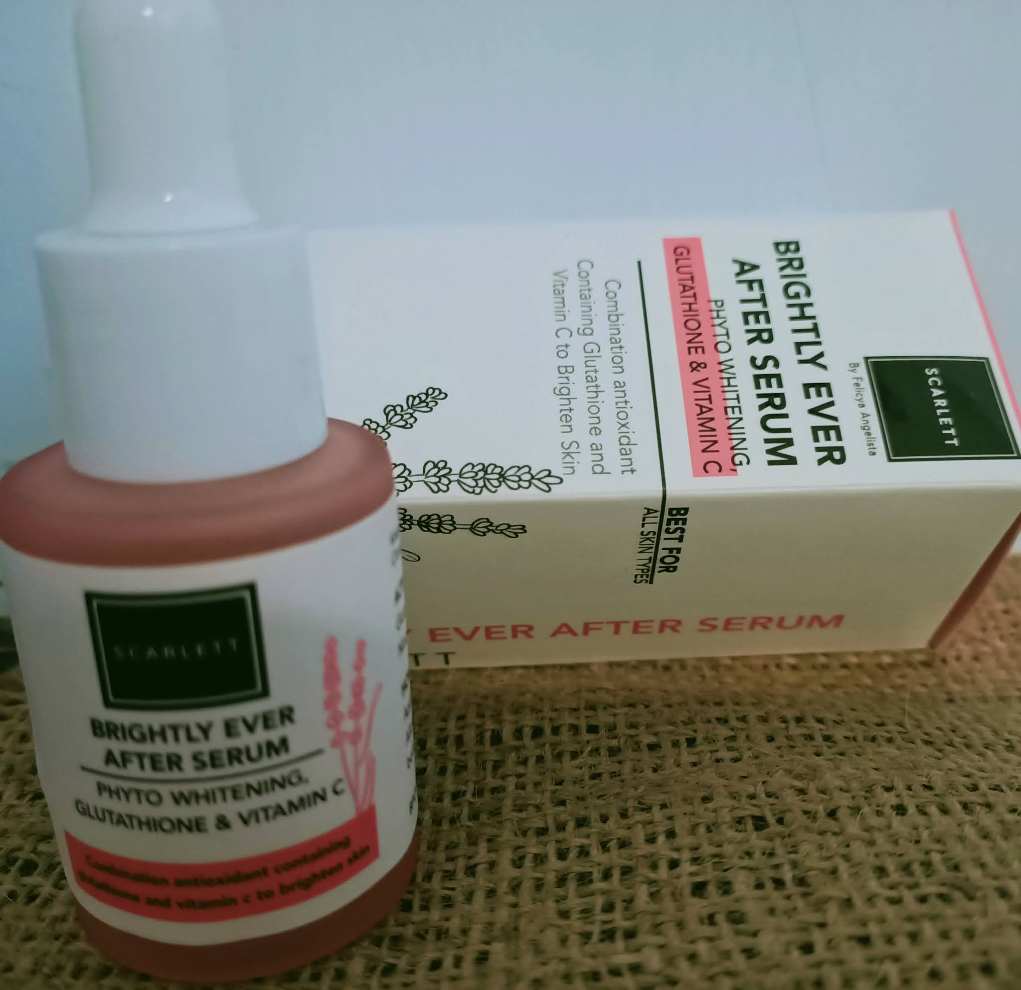 Setelah menggunakan Scarlett Whitening Brightly facial wash, saya menggunakan Scarlett Whitening Brightly Ever After Serum. Scarlett Whitening Brightly Ever After Serum mengandung phyto whitening, glutathione, vitamin C dan lavender water. Merupakan kombinasi anti oksidan dan vitamin C untuk membantu mencerahkan kulit wajah secara alami.