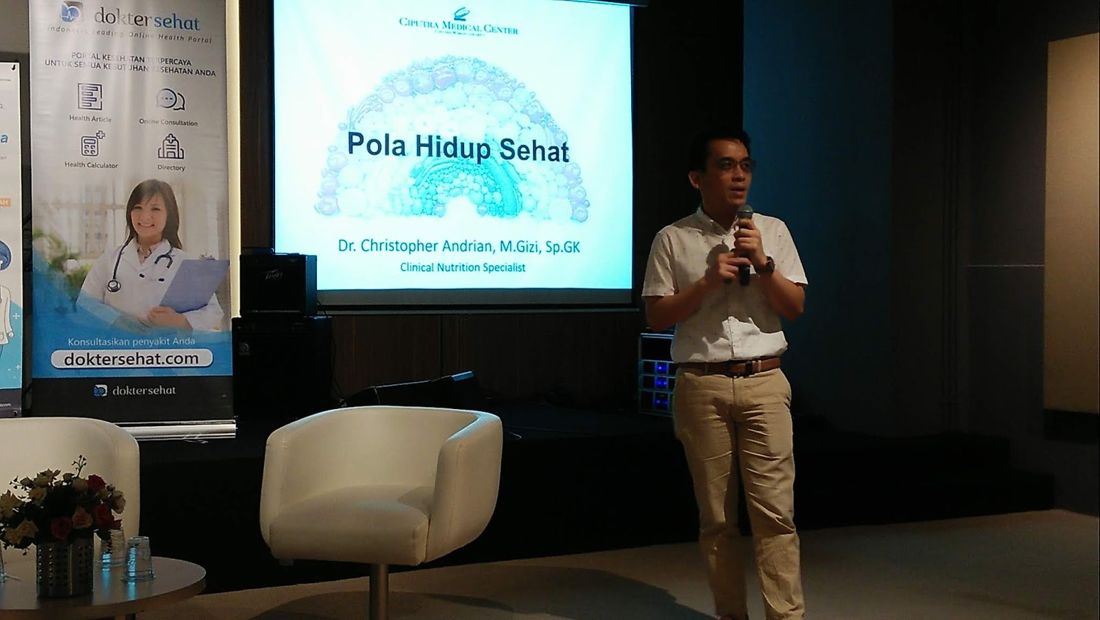 Pembicara pertama yaitu dr. Christopher memaparkan tentang pentingnya menjaga pola makan sehat (healthy eating) agar terhindar dari obesitas yang merupakan salah satu masalah kesehatan yang cukup merisaukan.